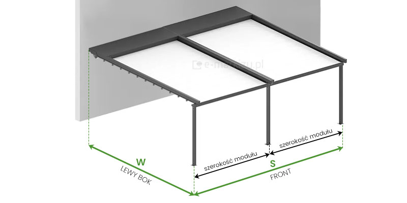 Pergola Tarasowa Przyścienna Solid Selt produkowana jest na wymiar. Jeżeli chodzi o szerokość to nie ma standardowych rozmiarów. Maksymalna szerokość jednego modułu to 400cm. Maksymalna szerokość dwóch modułów to 800cm. Maksymalna szerokość trzech modułów to 1200cm. Maksymalny wysięg to 700cm. Standardowa wysokość przednich podpór to 250cm (może być zwiększona maksymalnie do 300cm). Do zamówienia lub wyceny podajemy zawsze całkowitą zewnętrzną szerokość pergoli.