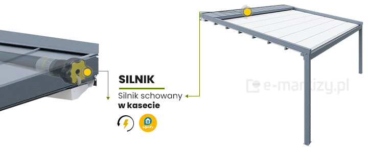 Silnik elektryczny z wbudowaną centralką bezprzewodową IO, która umożliwia sterowanie zadaszeniem za pomocą pilota bezprzewodowego IO oraz czujników atmosferycznych IO. Somfy IO to technologia 2 kierunkowa – nadajemy sygnał (np. aby dach pergoli został zwinięty) ale i odbieramy sygnał (np. na smartphonie możemy zobaczyć w jakim położeniu jest dach pergoli. Opcja dostępna po rozbudowaniu systemu o system Tahoma)