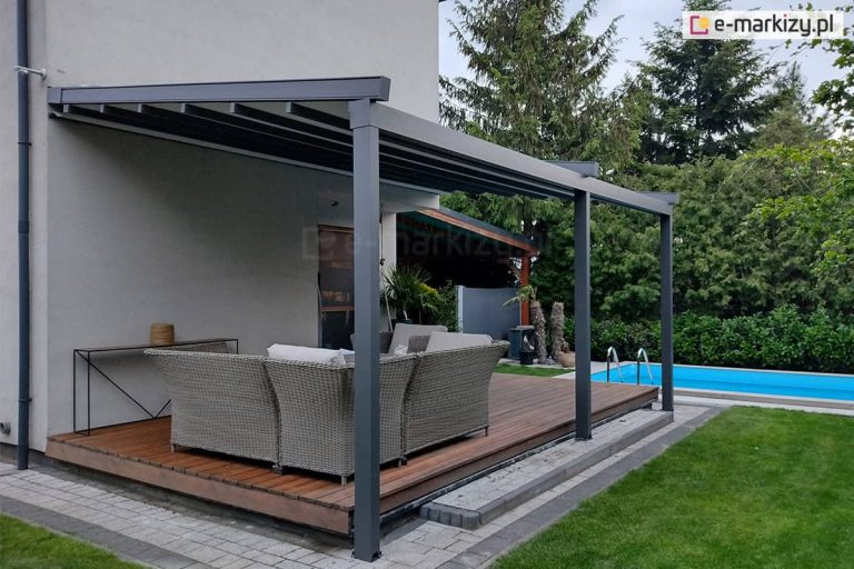 Na wysokość pergoli składa się wymiar podpory (standard 230cm) oraz pakietu zadaszenia, który zależny jest od kąta zamontowania konstrukcji do ściany