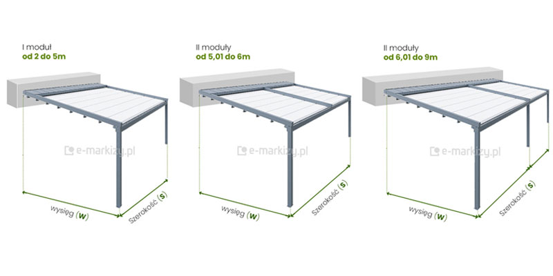 Pergola ogrodowa Square produkowana jest na wymiar. Jeżeli chodzi o szerokość to nie ma standardowych rozmiarów. Maksymalna szerokość jednego modułu to 500cm, a dwóch to 900cm. Maksymalny wysięg to 700cm. Standardowa wysokość przednich podpór to 230cm (można wykonać niższą lub wyższą). Do zamówienia lub wyceny podajemy zawsze całkowitą zewnętrzną szerokość pergoli.