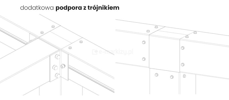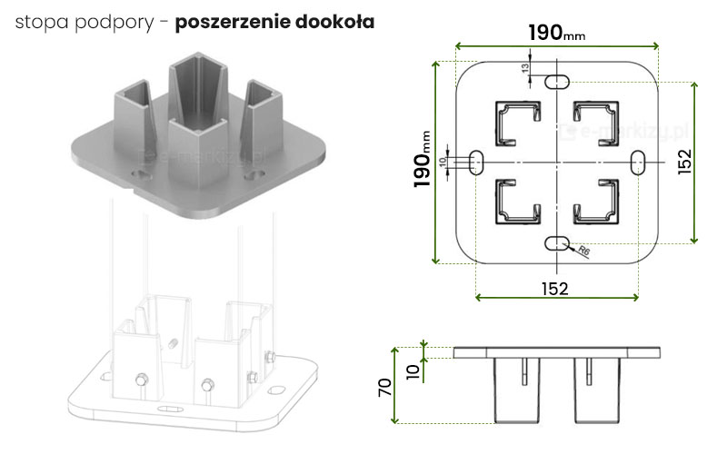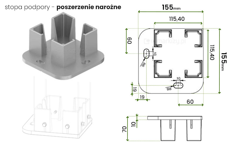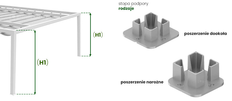 - Stopa z poszerzeniem narożnym – opcja do montażu w samym narożniku tarasu lub w przypadku montażu do podpór refleksoli lub innych osłon – brak poszerzenia po wewnętrznej stronie ułatwia montaż.
