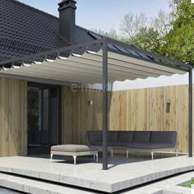 Nowoczesna Pergola Dragon standardowo występuje w 3 kolorach konstrukcji. Istnieje możliwość lakierowania na dowolny kolor z palety RAL. Tkanina pergoli Dragon opadająca do 5 lub 25cm. Dostępne są tkaniny akrylowe Dickson oraz Tkaniny PCV. Poprzeczki montowane poziomo lub pod kątem.