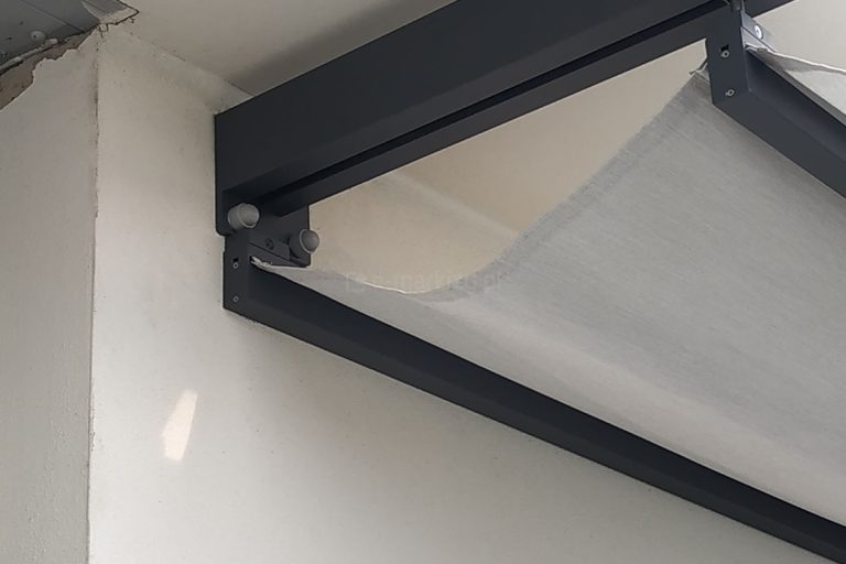 Daszek systemowy, czyli daszek ochronny, który chroni tkaninę przed zabrudzeniem. Kaseta wykonana jest w całości z aluminium i malowana pod kolor konstrukcji.
