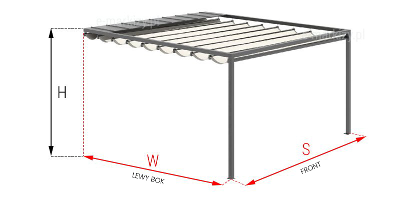 Pergola Tarasowa Przyścienna Dragon produkowana jest na wymiar. Jeżeli chodzi o szerokość to nie ma standardowych rozmiarów. Maksymalny wysięg to 460 cm. Pergola do szerokości 460cm posiada 1 moduł (dach pojedynczy), a powyżej tej szerokości konstrukcja składa się z dwóch dachów. Standardowa wysokość to 245 cm. Do zamówienia lub wyceny podajemy zawsze całkowitą zewnętrzną szerokość pergoli.