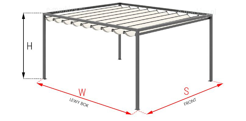 Pergola tarasowa wolnostojąca Dragon produkowana jest na wymiar. Jeżeli chodzi o szerokość to nie ma standardowych rozmiarów. Maksymalny wysięg to 460 cm. Pergola do szerokości 460cm posiada 1 moduł (dach pojedynczy), a powyżej tej szerokości konstrukcja składa się z dwóch dachów. Standardowa wysokość to 245 cm. Do zamówienia lub wyceny podajemy zawsze całkowitą zewnętrzną szerokość pergoli.
