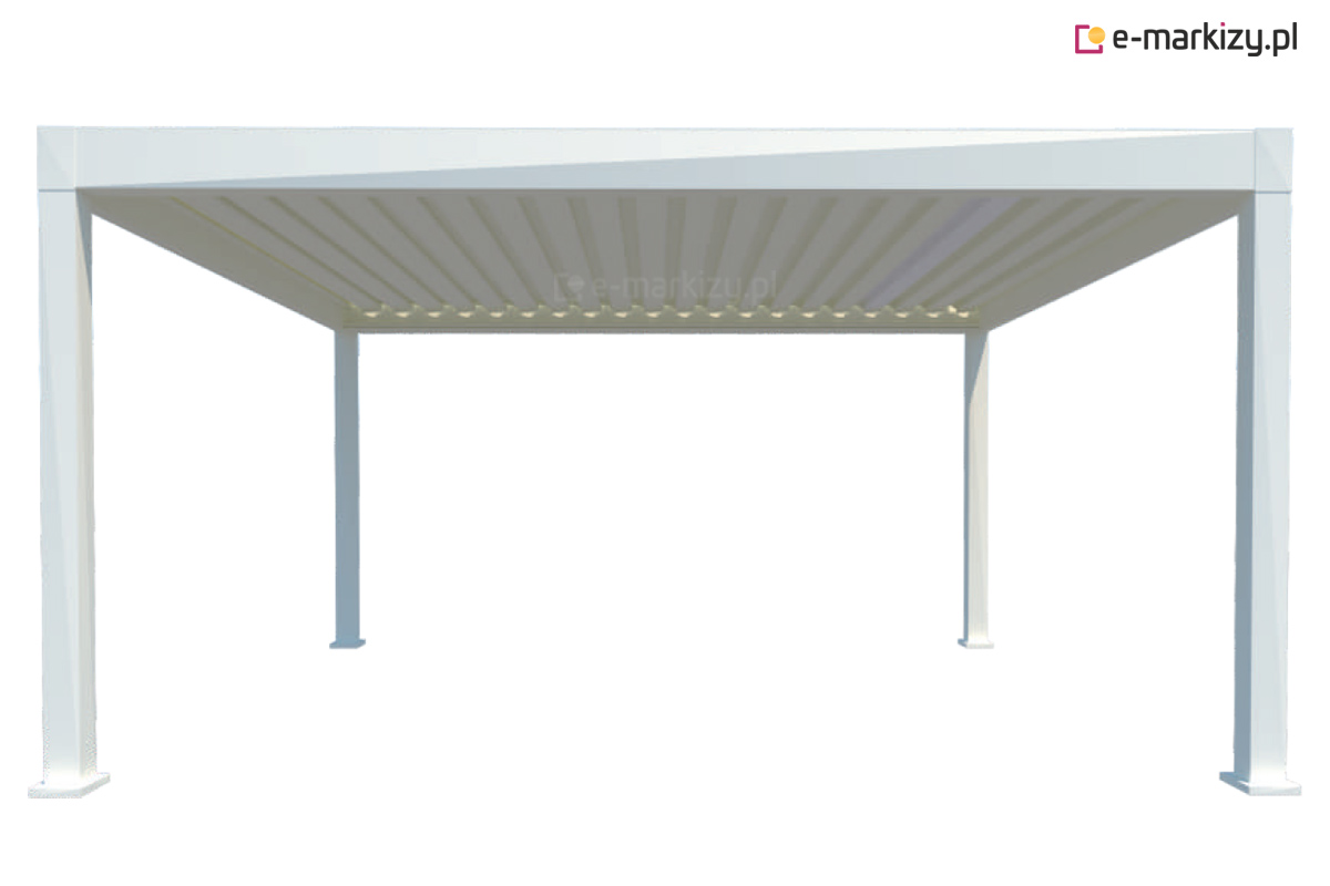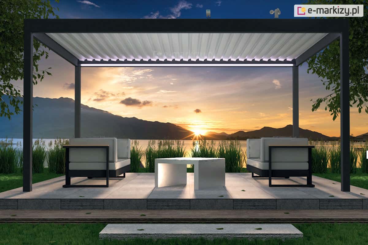 Pergola lamelowa Essential to lekka, nowoczesna pergola z dachem wykonanym z lameli aluminiowych. Obracane lamele w pozycji zamkniętej chronią taras przed słońcem i deszczem, a w pozycji uchylonej wpuszczają promienie słoneczne oraz umożliwiają cyrkulację powietrza. Konstrukcja pergoli wykonana jest z ekstrudowanego aluminium i posiada system odprowadzania wody w standardzie. Dla komfortu użytkowania zadaszonej przestrzeni, pergolę można doposażyć w zintegrowane taśmowe oświetlenie LED.