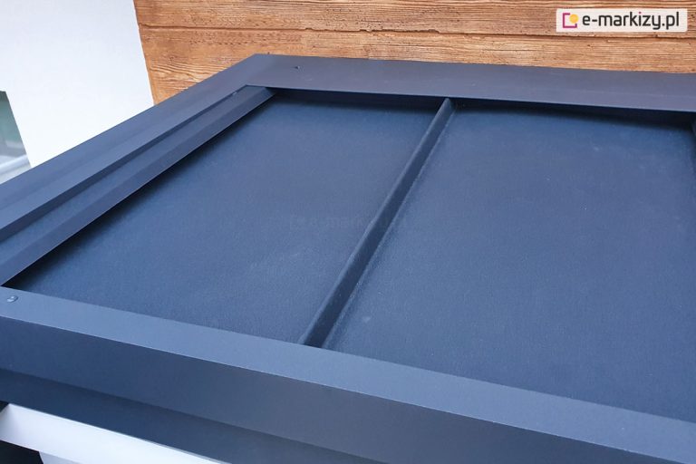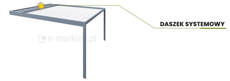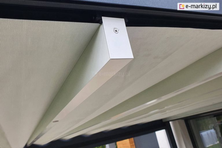 Pergolę można opcjonalnie wyposażyć w daszek systemowy, który chroni zwiniętą tkaninę od góry, zabezpieczając ją przed zabrudzeniami, wilgocią i opadającymi liśćmi. To szczególnie praktyczne rozwiązanie w okresach, gdy pergola pozostaje nieużywana przez dłuższy czas, a materiał pozostaje w pozycji złożonej. Kaseta wykonana jest w całości z aluminium i malowana w kolorze konstrukcji, dzięki czemu idealnie komponuje się z pergolą i stanowi estetyczne wykończenie całości.