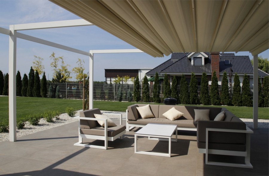 Pergola posiada opcjonalny daszek, który chroni zwiniętą tkaninę