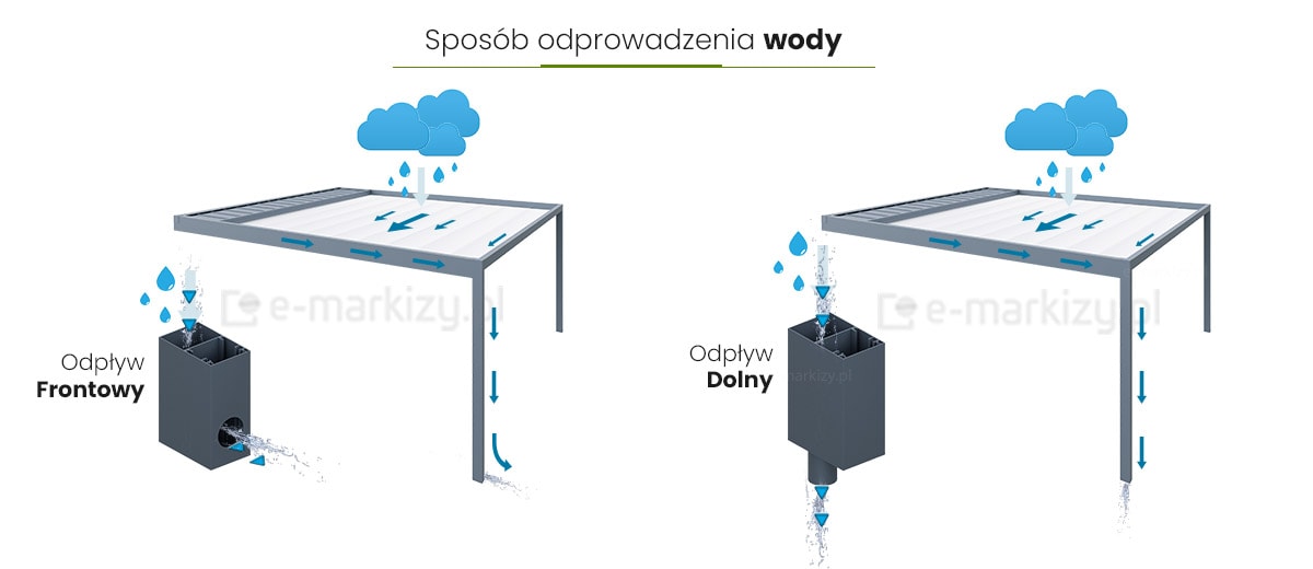 Frontowy pas rynnowy jest całkowicie zintegrowany z konstrukcją, dzięki czemu pozostaje niewidoczny i nie zaburza estetyki pergoli. Woda opadowa swobodnie spływa do przedniej części systemu, skąd dalej kierowana jest do podpór pełniących funkcję odprowadzenia wody. Rynny można umieścić po obu stronach pergoli lub tylko po jednej, w zależności od potrzeb montażowych i układu tarasu, zapewniając skuteczne i kontrolowane odprowadzanie deszczówki.