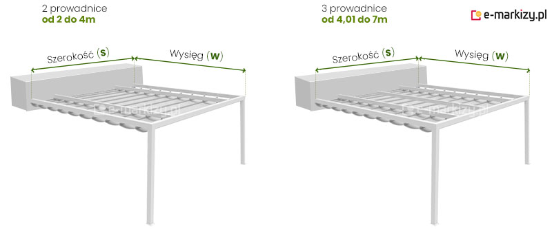 Pergola Tarasowa Przyścienna Tako produkowana jest na wymiar. Jeżeli chodzi o szerokość to nie ma standardowych rozmiarów. Maksymalna szerokość jednego modułu (2 prowadnice) to 400cm, a dwóch modułów (3 prowadnice) to 700cm, ale ilość prowadnic może zostać zwiększona. Maksymalny wysięg to 700cm. Standardowa wysokość przednich podpór to 300cm. Do zamówienia lub wyceny podajemy zawsze całkowitą zewnętrzną szerokość pergoli.