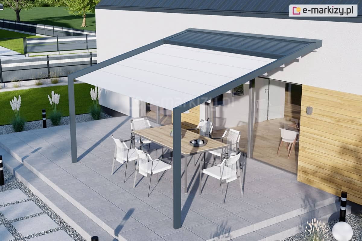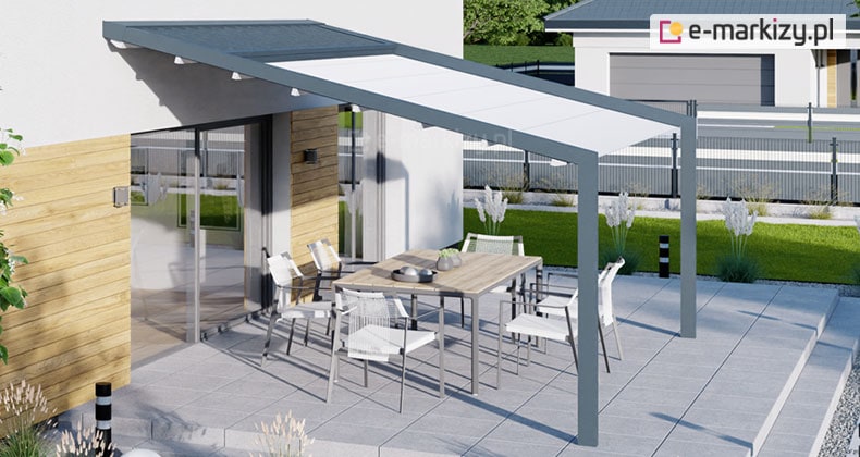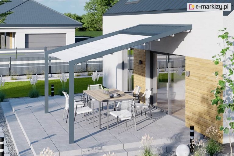 To model montowany wyłączenie do ściany budynku. Nie posiada widocznego pasa rynnowego na froncie konstrukcji, co sprawia, że wygląda lekko i nowocześnie