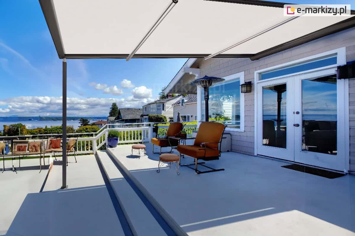 Pergola Tarasowa Przyścienna V ZIIIP Selt to kompatybilna konstrukcja o ciekawych, zaokrąglonych elementach. Rozwijany automatycznie dach tkaninowy z cichym napędem umożliwia komfortowe korzystanie z przestrzeni tarasu i schronienie przed promieniami słonecznymi.