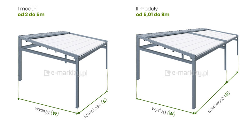 Pergola ogrodowa Square Mol produkowana jest na wymiar. Jeżeli chodzi o szerokość to nie ma standardowych rozmiarów. Maksymalna szerokość to 900cm. Maksymalny wysięg to 550cm. Standardowa wysokość przednich podpór to 230cm (można wykonać niższą lub wyższą). Do zamówienia lub wyceny podajemy zawsze całkowitą zewnętrzną szerokość pergoli.