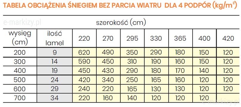 Tabela obciążenia śniegiem bez parcia wiatru (dla pergoli na 4 podporach)