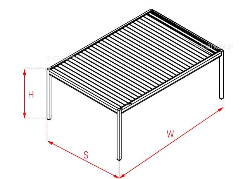 S=Szerokość całkowita pergoli W=Wysięg pergoli