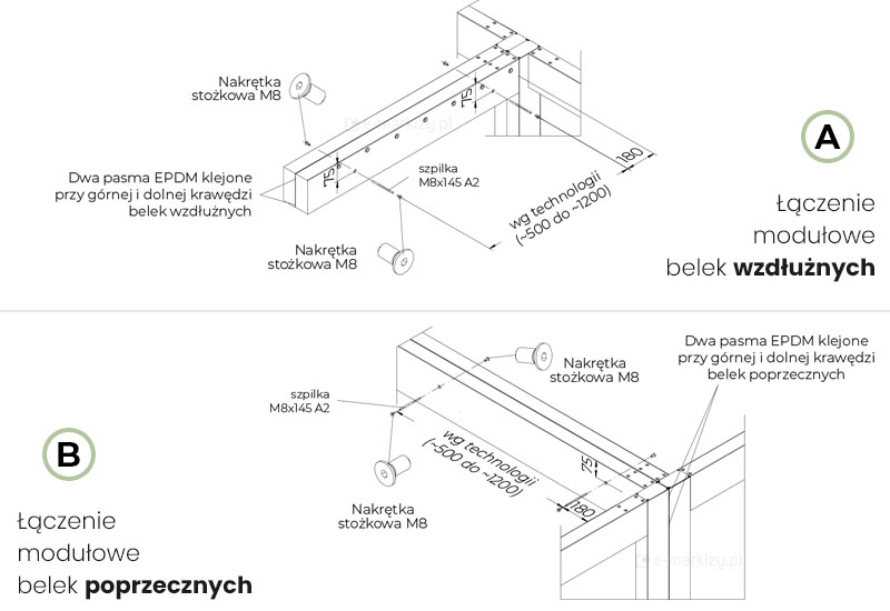 Łączenie konstrukcji odbywa się za pomocą dedykowanych szpil nierdzewnych, nakrętek stożkowych. Podpory nie są ze sobą łączone. Styki belek uszczelniane są przez 2 pasma taśmy samoprzylepnej EPDM (nie zapewnia ona wodoszczelności)