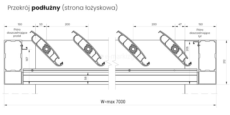 Możliwy odwrotny spadek piór (na silnik) lub pióra poziomo 43 mm od góry belki.