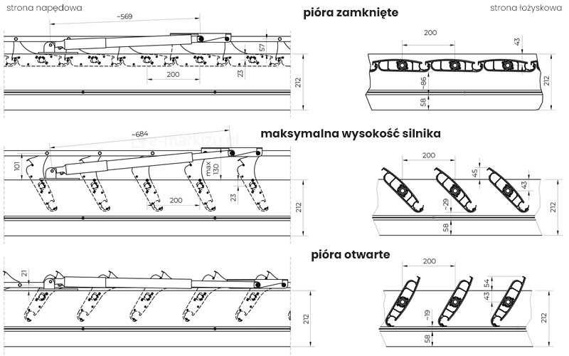 – max. kąt otwarcia piór do 90 stopni od położenia zamkniętego do 120 stopni od położenia zamkniętego