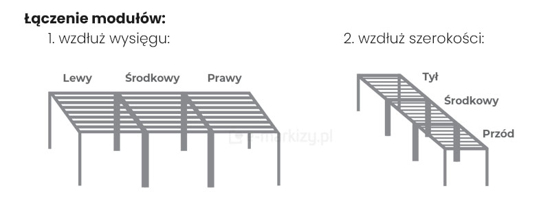 Nieograniczona ilość pergol może zostać połączona wzdłuż wysięgu lub wzdłuż szerokości