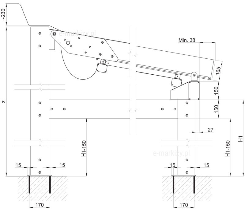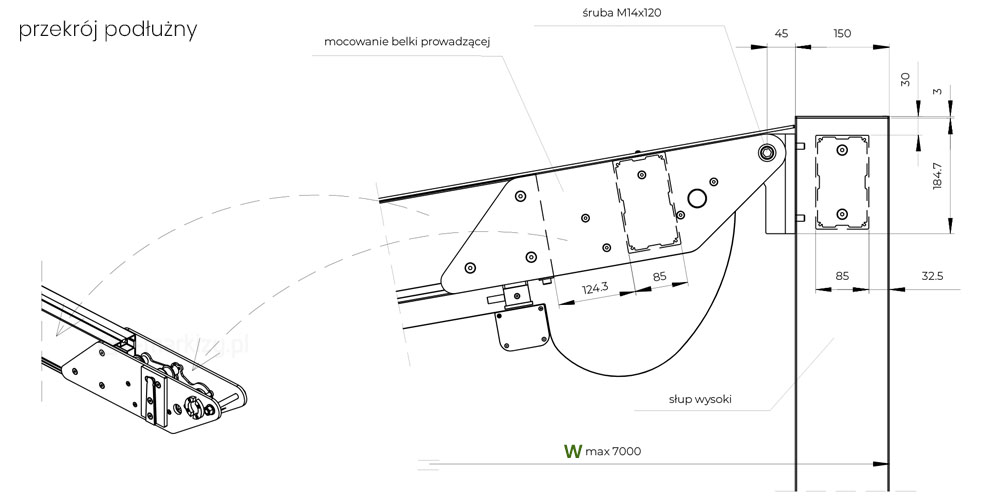 • wysięg 700cm, kąt pochyłu 5° = 3450mm