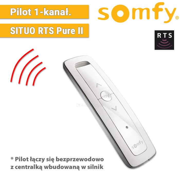 Pilot Situo 1 RTS Pure II – jednokanałowy pilot przenośny Somfy do lokalnego sterowania jednym napędem RTS lub grupą napędów RTS (odbiorniki RTS). Do sterowania roletami zewnętrznymi, markizami, ekranami.