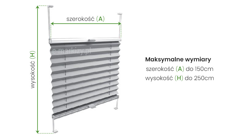 Żaluzje plisowane na okna dachowe produkowane są na wymiar. Maksymalna szerokość żaluzji to 150cm, a wysokość to 250cm. Do zamówienia lub wyceny podajemy zawsze całkowity zewnętrzny wymiar osłony.