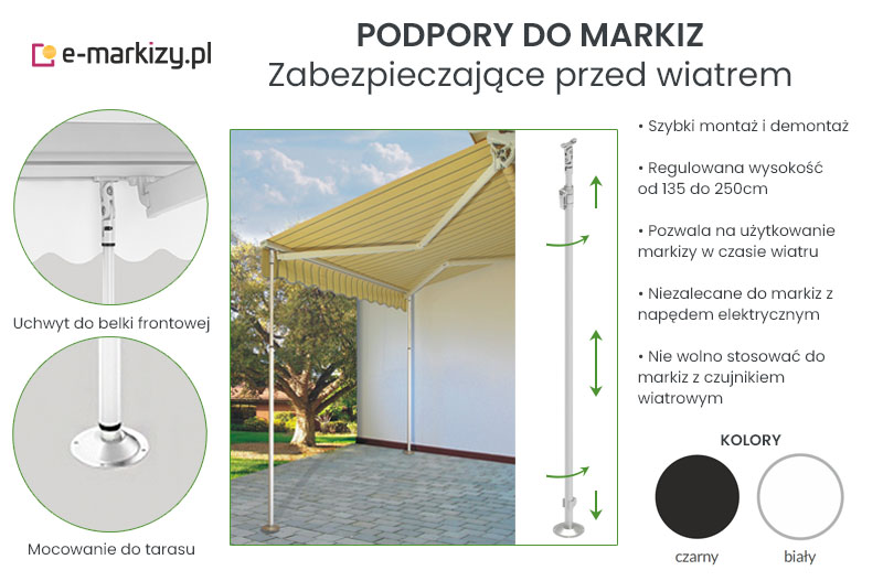 Podpory markizowe dostępne są w kolorze białym lub czarnym.