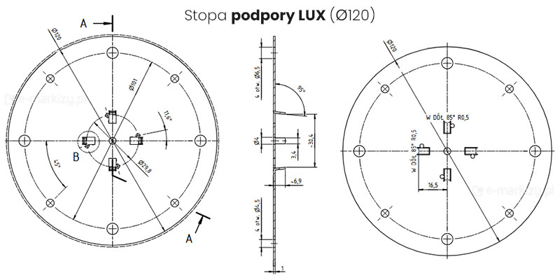 Podpory markizowe dostępne są w kolorach: biel (RAL 9010), beż (RAL 1015), brąz (RAL 8014), srebrny (RAL 9006), grafit strukturalny (71319)