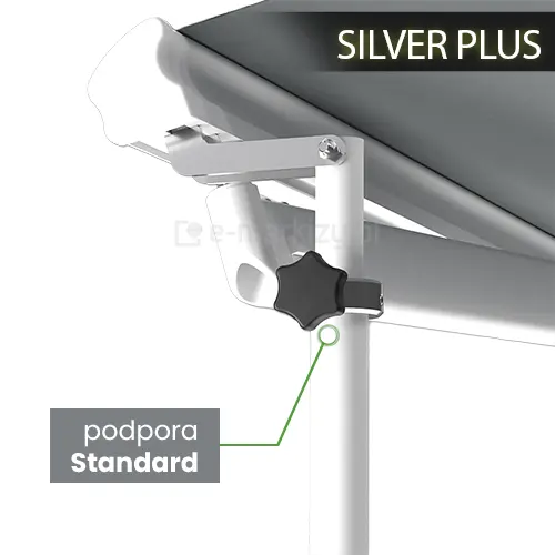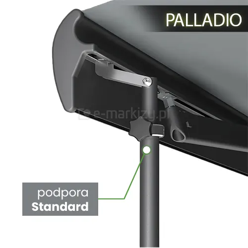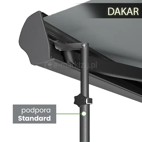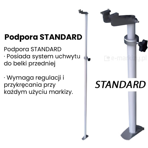 Podpora teleskopowa Standard do markiz posiada system uchwytu do belki przedniej. Wymaga regulacji i przykręcania przy każdym użyciu markizy z podporami.