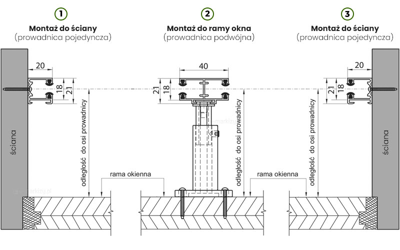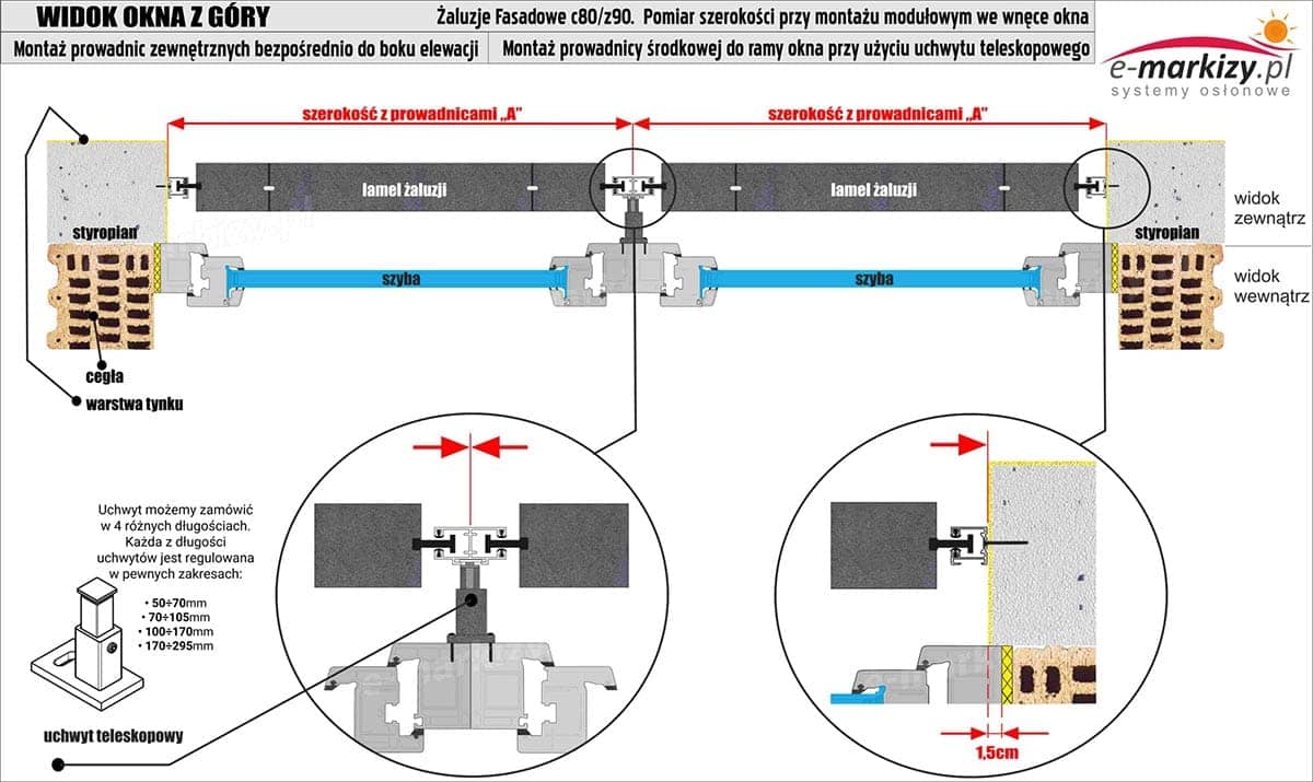 Pomiar szerokości przy montażu modułowym we wnęce okna – Montaż prowadnic zewnętrznych bezpośrednio do boku elewacji. Montaż prowadnicy środkowej do ramy okna przy użyciu uchwytu teleskopowego.
