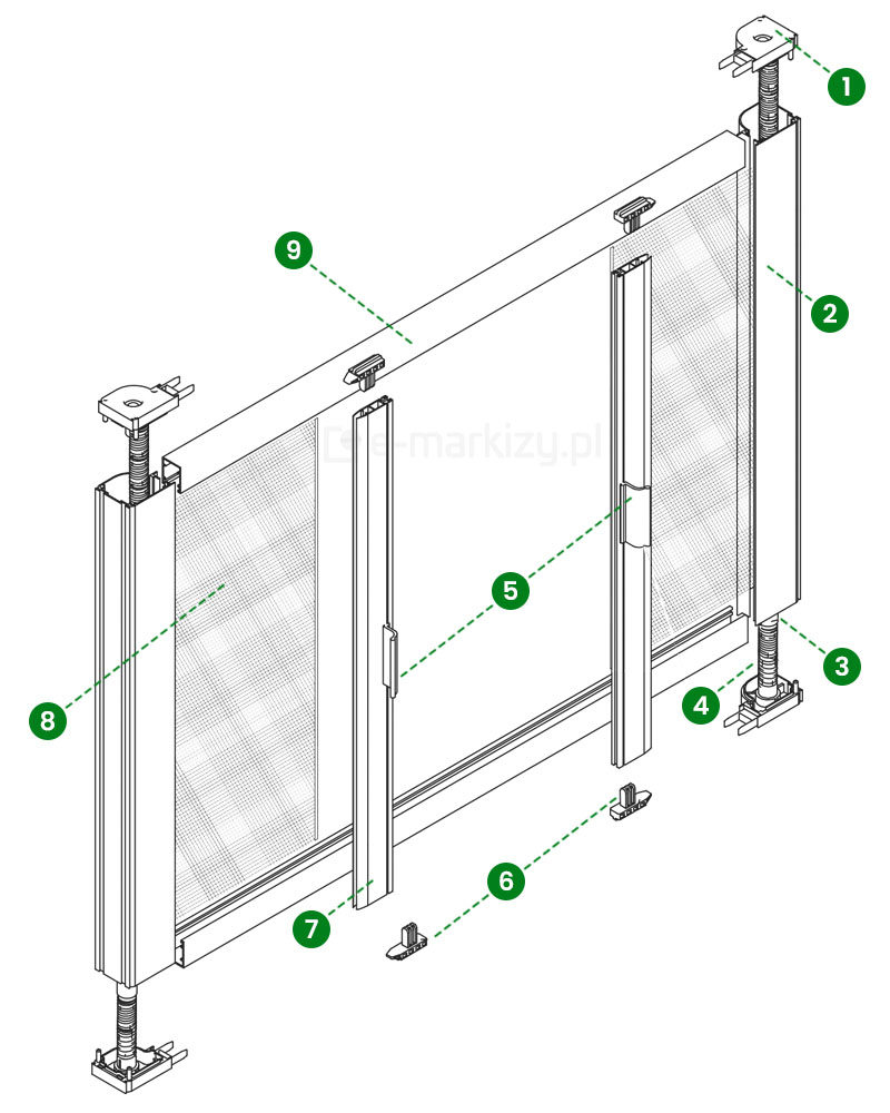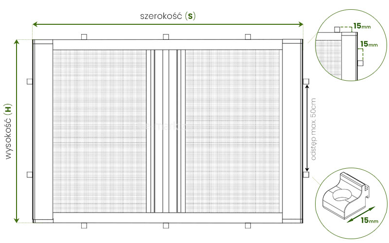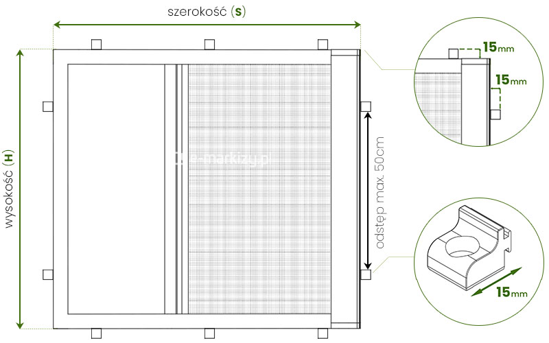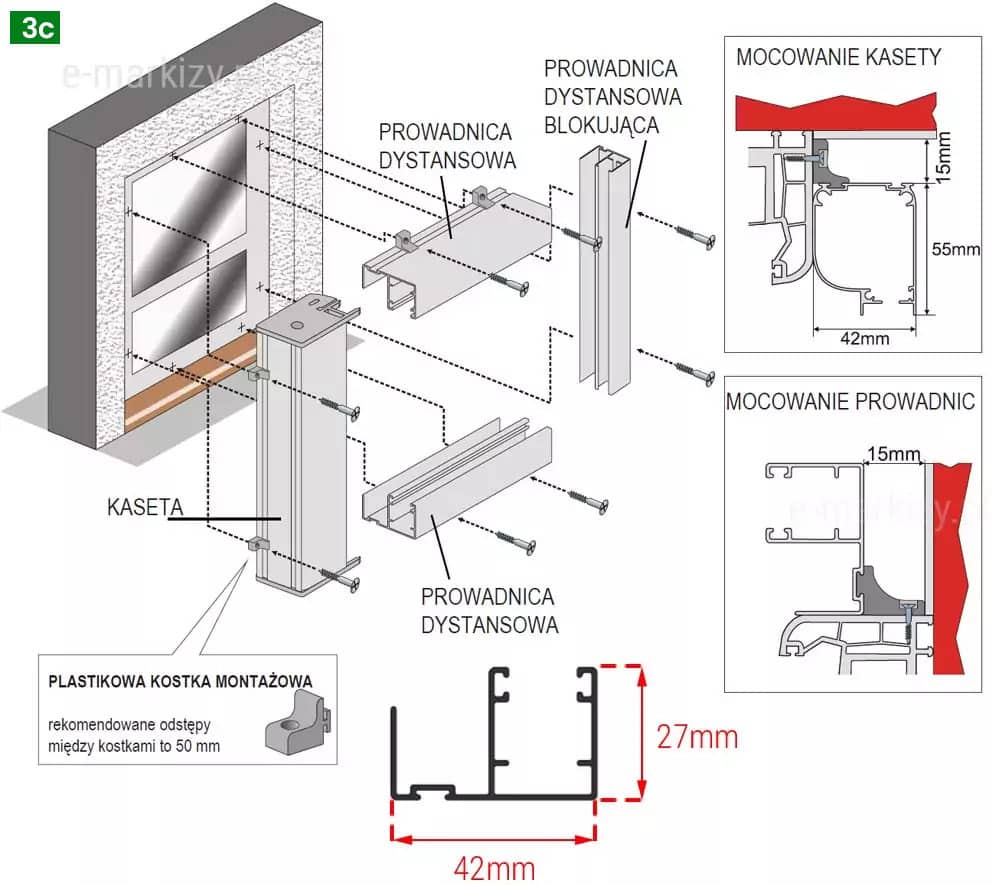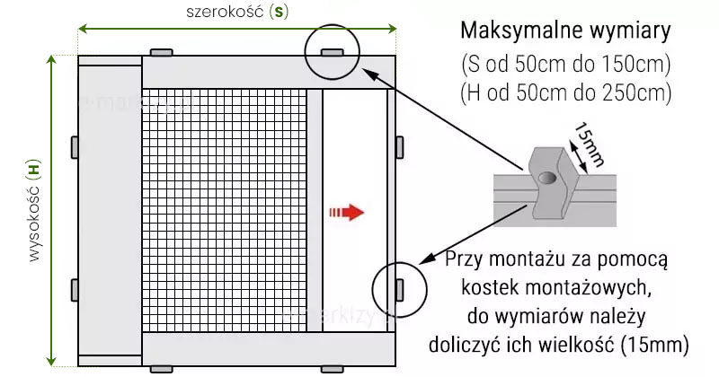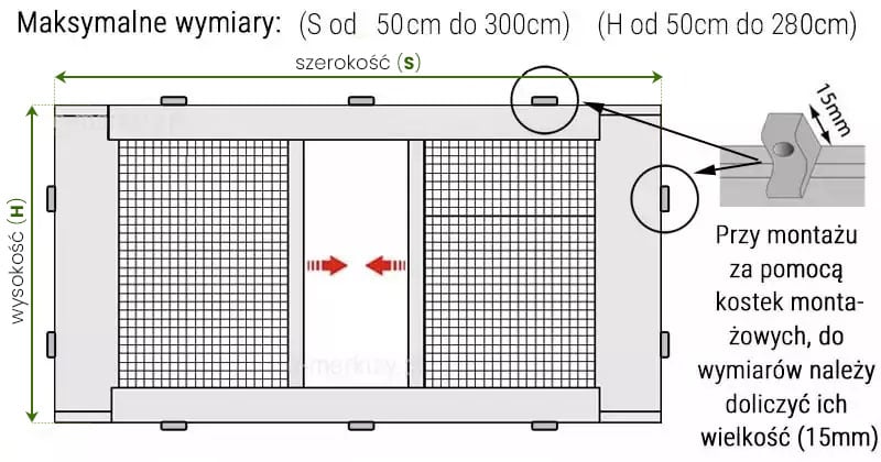 Rekomendowane odstępy między kostkami montażowymi moskitiery to 50cm