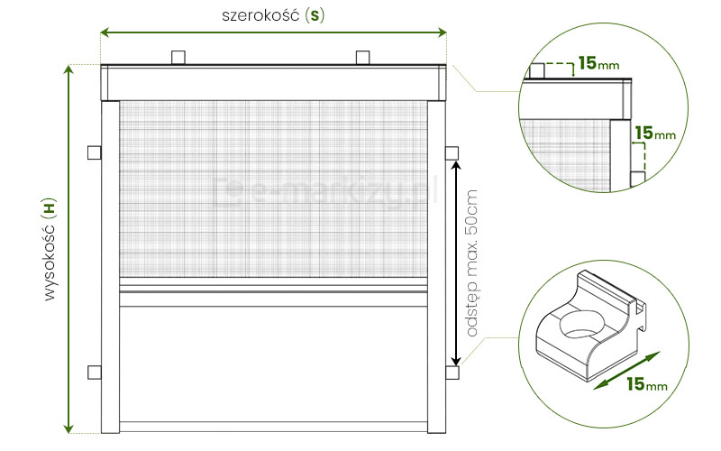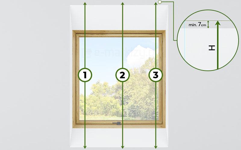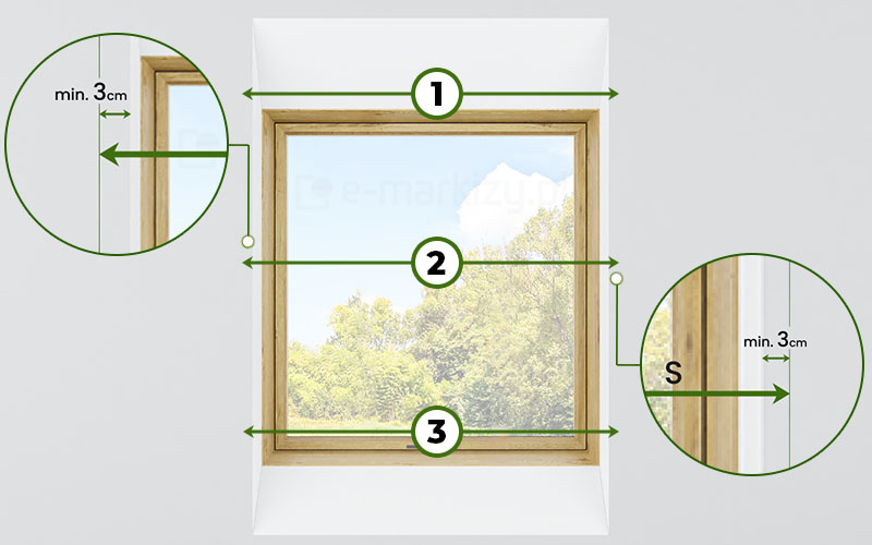 Wymiary należy ściągnąć najlepiej w 3 lub więcej miejscach (rysunki poniżej). Wnęka okienna jest zazwyczaj nierówna, dlatego należy podać najmniejszy zmierzony wymiar wnęki okiennej na zewnątrz okna. Dla prawidłowego działania moskitiery zaleca się zamawiać szerokość rolety większą o conajmniej 3cm z lewej i 3cm z prawej strony otworu wnękowego. Wysokość całkowita powinna być minimalnie o 7cm większa niż otwór wnękowy (na montaż kasety oraz zakładkę dla belki dolnej). Przed dokonaniem pomiarów powinno się także oczyścić wnękę z zalegających zabrudzeń.