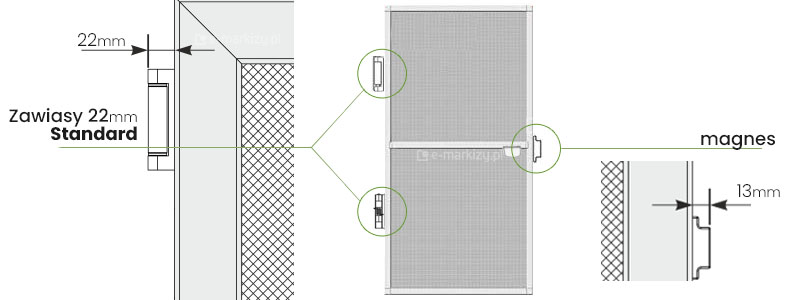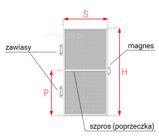 Należy pamiętać, że szerokość S przy zamówieniu moskitiery nie zawiera wymiarów zawiasów oraz magnesu