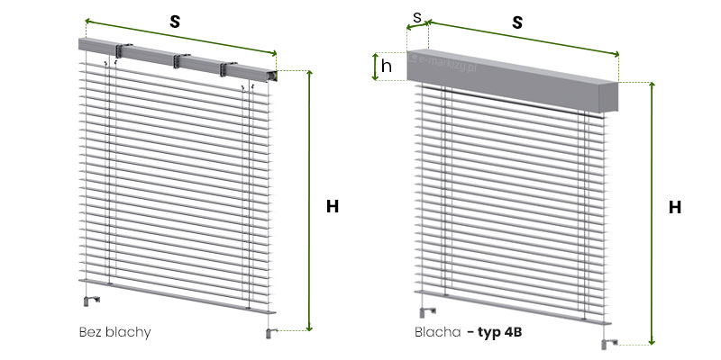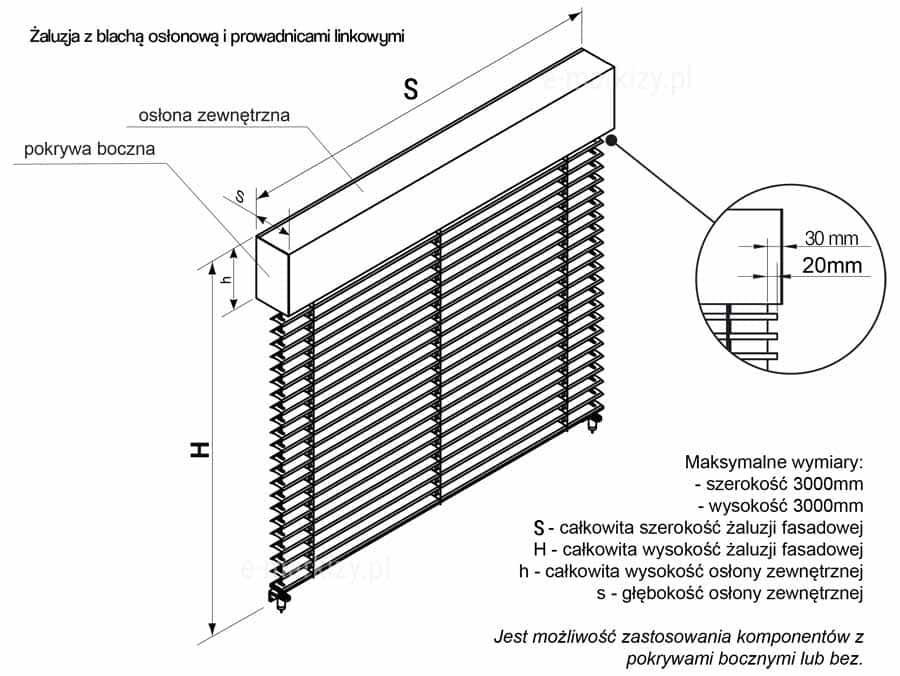 Określając wymiary żaluzji fasadowych, podajemy zawsze jej zewnętrzne skrajne wartości, czyli szerokość S i wysokość H.