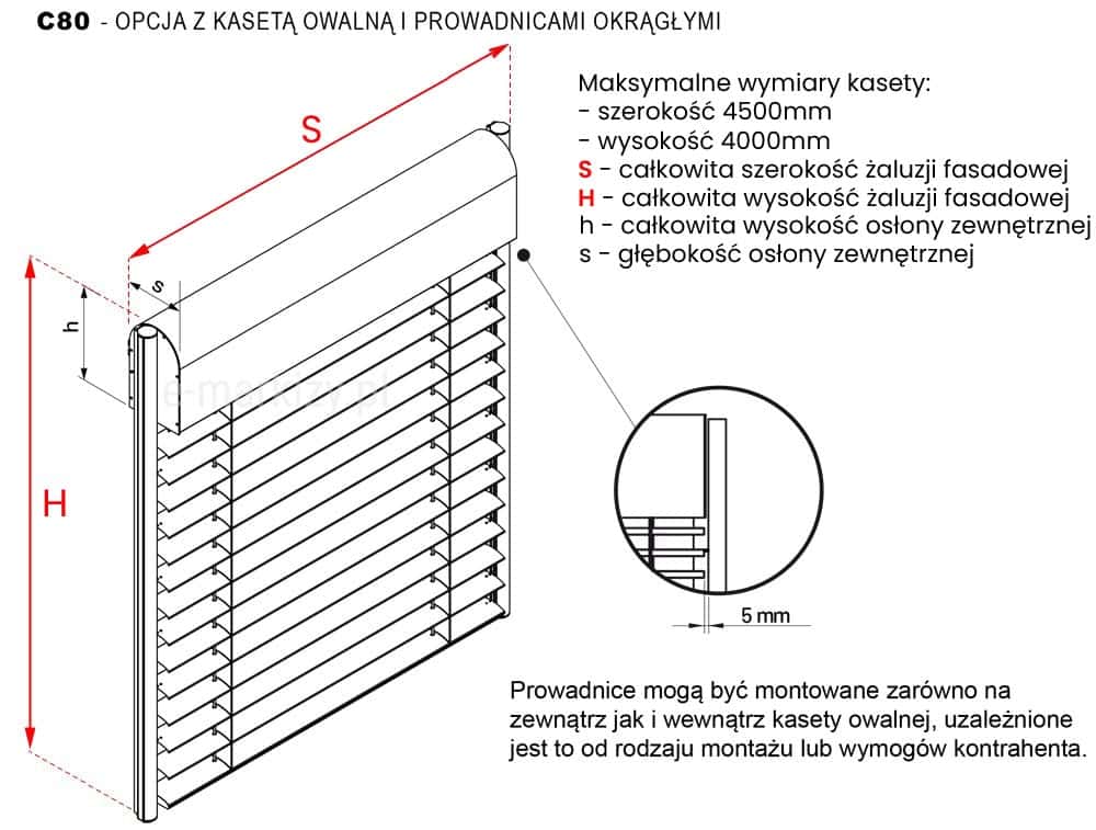 Pomiar żaluzji fasadowych C80 Oval - Żaluzja c80 oval wysokość pakietu, wysokość zwiniętej żaluzji w kasecie owalnej, Żaluzje c80 oval wymiarowanie, pomiar żaluzji fasadowych selt, Żaluzja c80 oval szczegóły pomiaru, jak mierzyć żaluzje fasadowe owalne