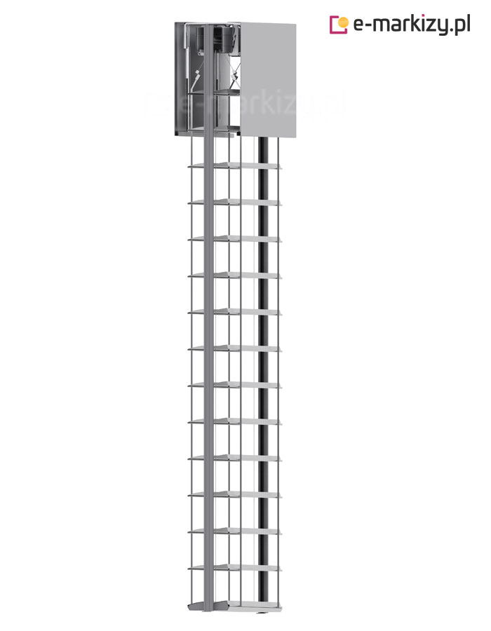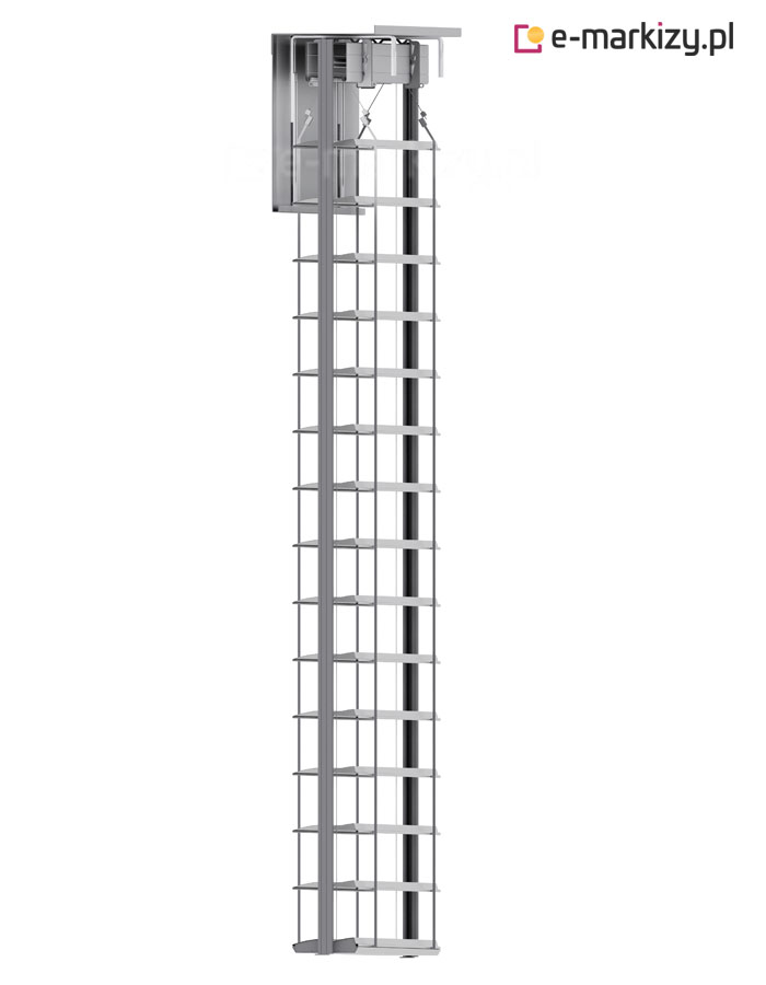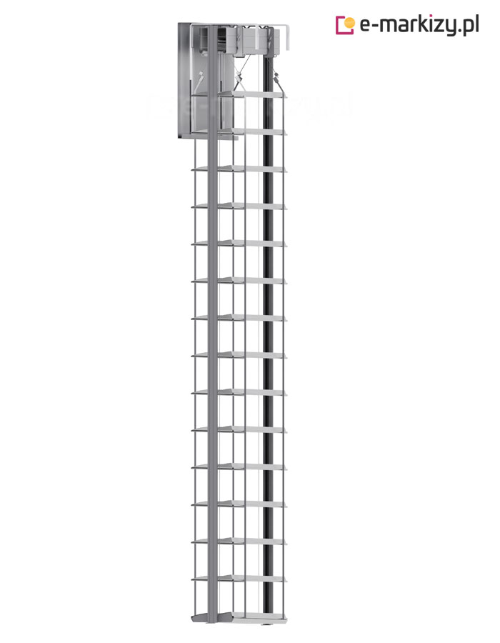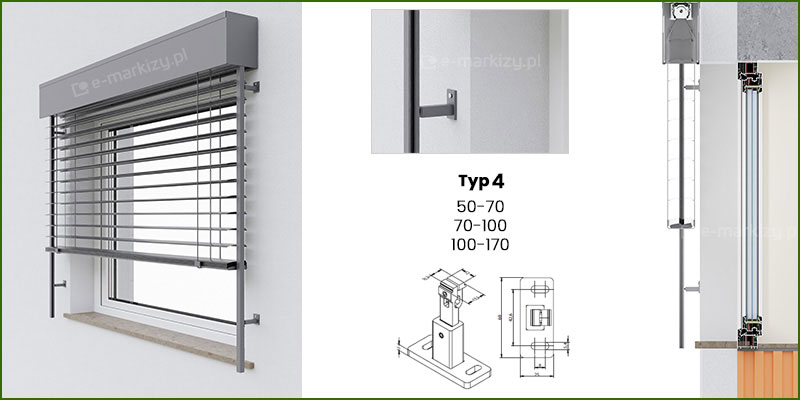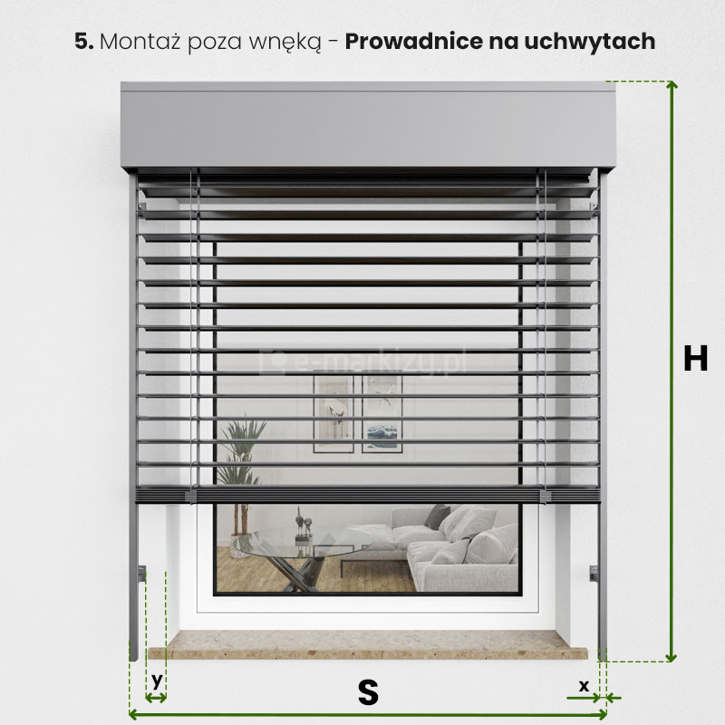 5 – przykład Pomiaru – prowadnice listwowe na uchwytach prostych. Montaż poza wnęką, prowadnice na uchwytach do fasady budynku, blacha zabudowana lub niezabudowana