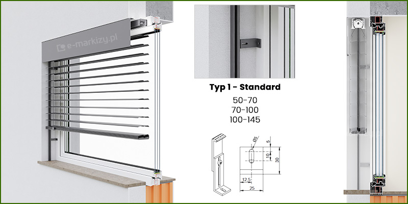 1 – przykład Pomiaru – prowadnice listwowe na uchwytach kątowych. Montaż we wnęce, prowadnice na uchwytach do ramy okna, blacha zabudowana lub niezabudowana
