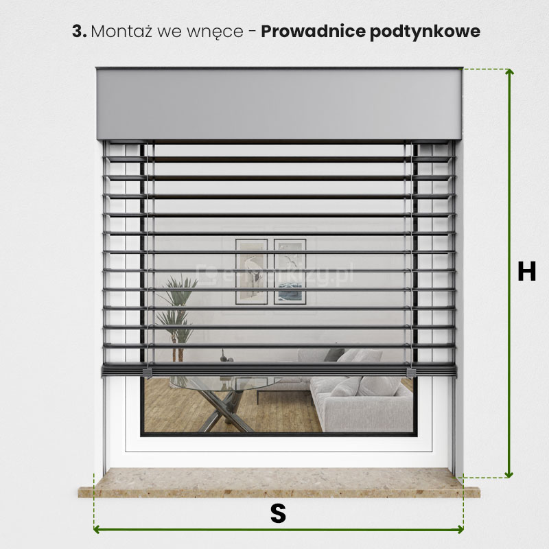 2 – przykład Pomiaru – prowadnice listwowe bez uchwytów. Montaż we wnęce, prowadnice bez uchwytów ramy okna, blacha zabudowana lub niezabudowana