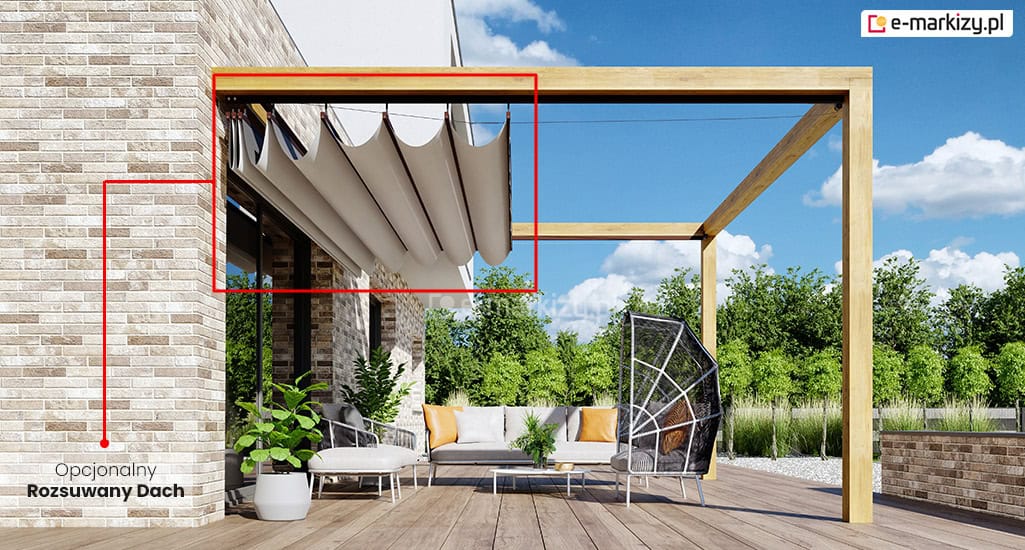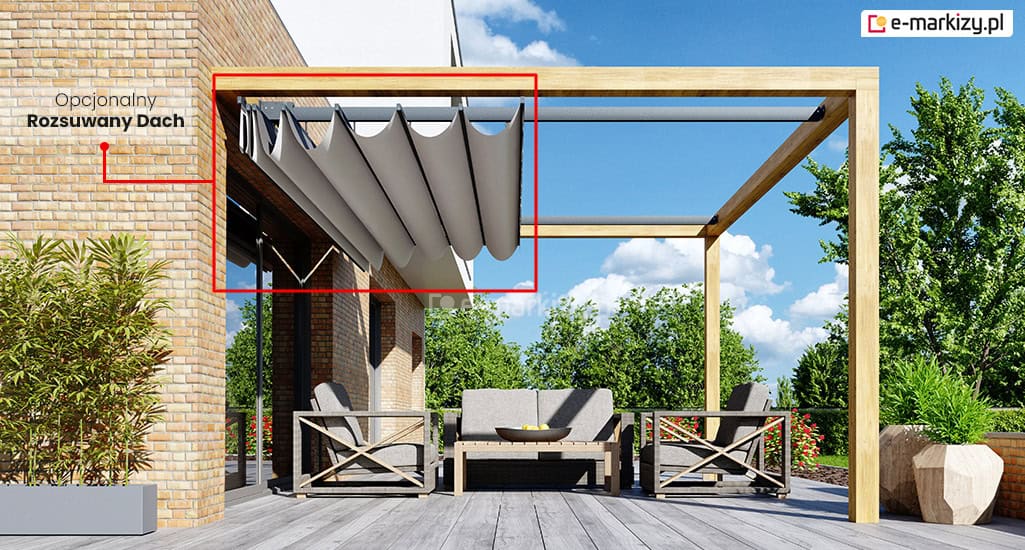 Drewniana pergola tarasowa to uniwersalna podstawa pod rozwijane zadaszenie tarasu, które będzie chronić przed deszczem i słońcem. Najpopularniejszym rozwiązaniem wykorzystywanym na konstrukcjach drewnianych są dachy rzymskie, czyli rozwijane zadaszenia tkaninowe, układające się w charakterystyczne fale. Tego typu zadaszenie rzymskie posiada tkaninę wybraną z myślą o stosowaniu na zewnątrz, więc posiada odpowiednie właściwości zapewniające odbijanie promieni słonecznych, a odpowiednie nachylenie pozwala skutecznie zapobiegać gromadzeniu się deszczówki i jej odpływowi na jedną ze stron dachu.