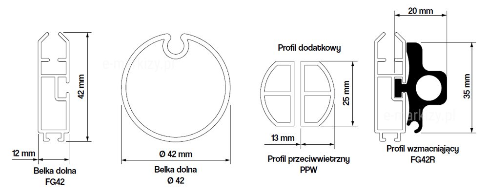 Belka dolna: Fi 42 (zewn. i wewn.); FG42 z profilem wzmacniającym FG42R (wewn.)