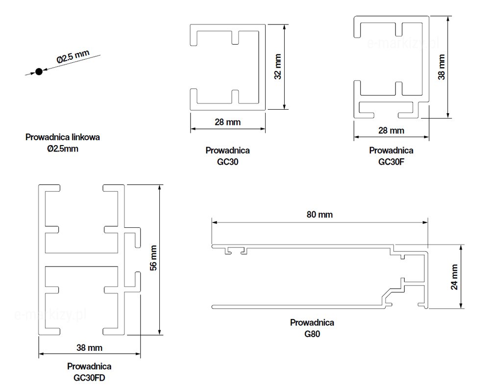 Prowadnice: Listwowe: G80 (wewnętrzna), GC30, GC30F, GC30FD, Linka fi 2,5 mm