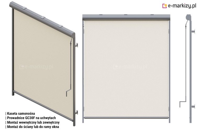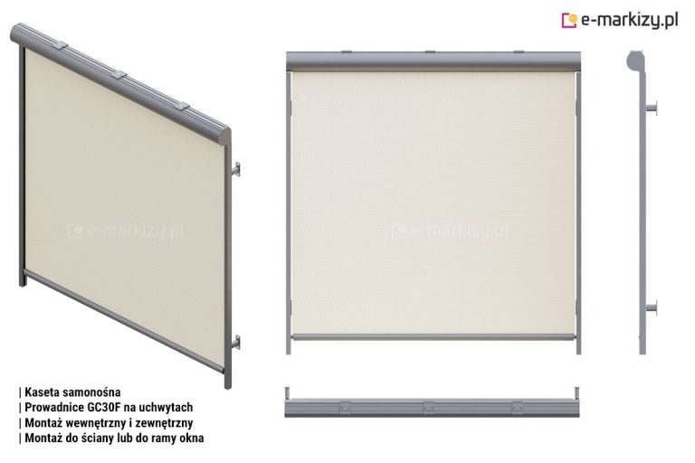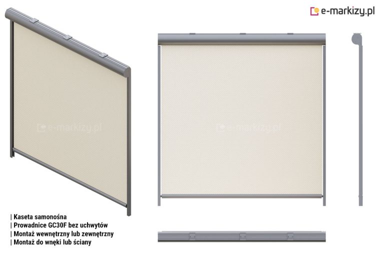 Refleksol 103 to system kasetowy. To rozbudowany w możliwości system, który w zależności od dobranej konfiguracji, może być wyposażony w profile przeciwwietrzne ANTYWIND, estetyczne linki z naciągiem lub funkcję pełnego zaciemnienia (wyłącznie do stosowania wewnątrz). Prowadnice GC30F i GC30FD mogą stanowić element nośny dla kasety. Osłonę można doposażyć w silnik elektryczny i prowadnice boczne linkowe lub aluminiowe.