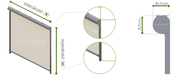 Refleksol 103 produkowany jest na wymiar. Przy prowadnicach linkowych maksymalna szerokość to 350cm a wysokość to 300cm, przy montażu na prowadnicach listwowych maksymalna szerokość to 450cm a wysokość to 400cm. Do zamówienia lub wyceny podajemy zawsze całkowity zewnętrzny wymiar osłony, łącznie z kasetą.