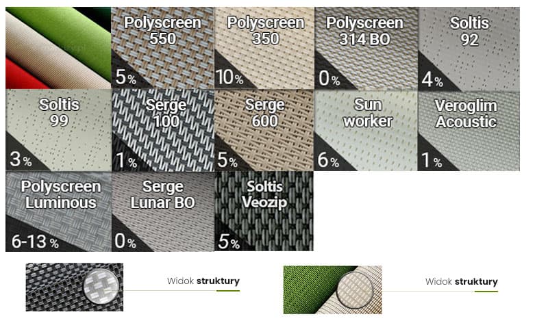 Szeroki wachlarz tkanin, pozwala na dopasowanie koloru rolety do architektury budynku oraz dobór odpowiedniego współczynnika przenikania promieni słonecznych. System wyposażony został w system naciągu tkaniny, który utrzymuje jej napięcie nawet na dużych powierzchniach. Tkaniny akrylowe to kolekcja stosowana głównie w markizach, tkaniny typu Screen są połączeniem PCV i poliestru, zależnie od wybranej grupy posiadają inne właściwości takie jak przepuszczalność światła czy dźwięku.