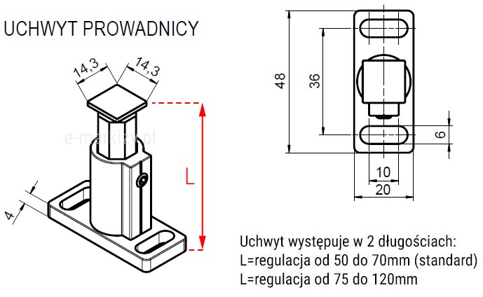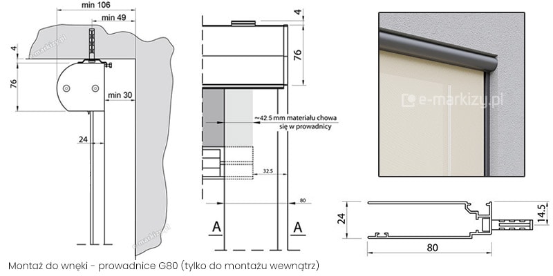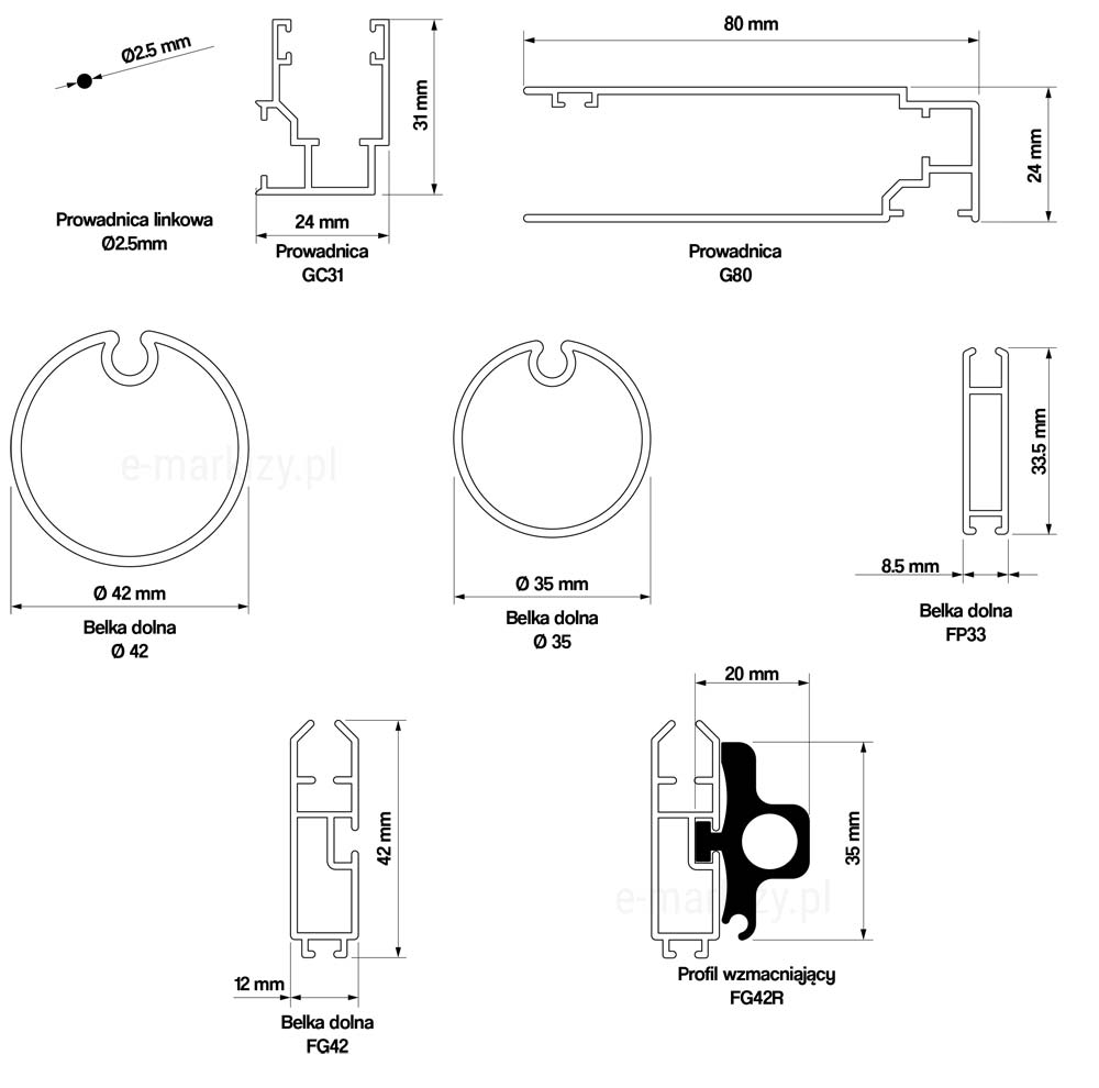 Prowadnice: Listwowe: G80 (wewnętrzna), G31, Linka fi 2,5 mm