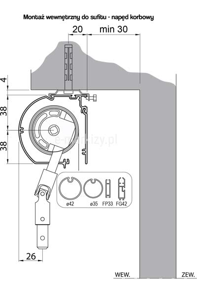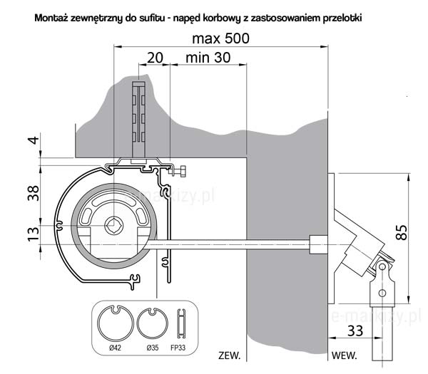 Montaż zewnętrzny do sufitu – napęd ręczny z przelotką