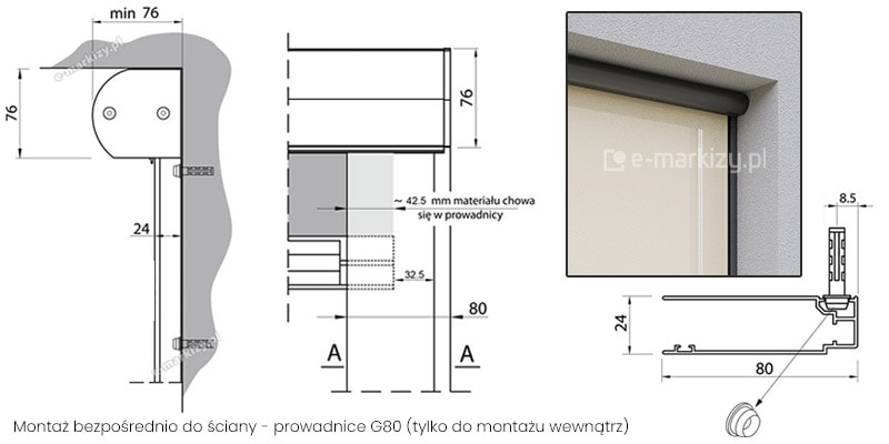 Rysunek pokazuje Refleksol 76 przy montażu zewnętrznym do ściany. Sterowanie korbowe ręczne z przepustem ściennym (przelotką) pozwala na sterowanie osłoną zewnętrzną z wewnątrz pomieszczenia.