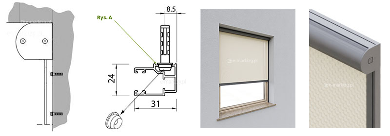 Prowadnice wąskie (G31) mocowane są bezpośrednio (bez uchwytów) do powierzchni czołowej np. ramy/okna/ściany/fasady. Aby zamocować prowadnice, należy użyć specjalnych nasadek (rys. A), na które „doczepia się” prowadnice. Przy tym sposobie montażu, kaseta jest „samonośna”, tzn. kaseta przymocowana jest stabilnie do prowadnic i nie ma potrzeby mocować jej dodatkowo do podłoża (opcjonalnie można ją przytwierdzić do sufitu za pomocą klipów sufitowych dołączonych do zestawu).