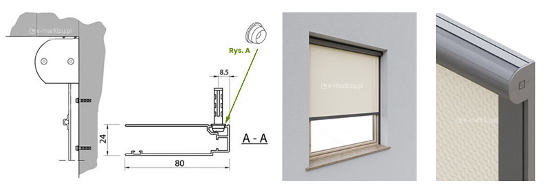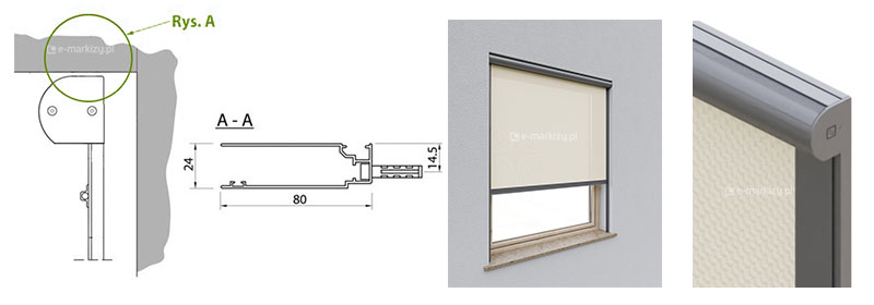 Prowadnice (G80) mocowane są bezpośrednio (bez uchwytów) do bocznej powierzchni wnęki okna. Aby zamocować prowadnice, należy przewiercić je w kilku miejscach i przytwierdzić do wnęki. Przy tym sposobie montażu, kaseta jest “samonośna”, tzn. kaseta przymocowana jest stabilnie do prowadnic i nie ma potrzeby mocować jej dodatkowo do podłoża (opcjonalnie można ją przytwierdzić do sufitu za pomocą klipów sufitowych dołączonych do zestawu – rys. A).