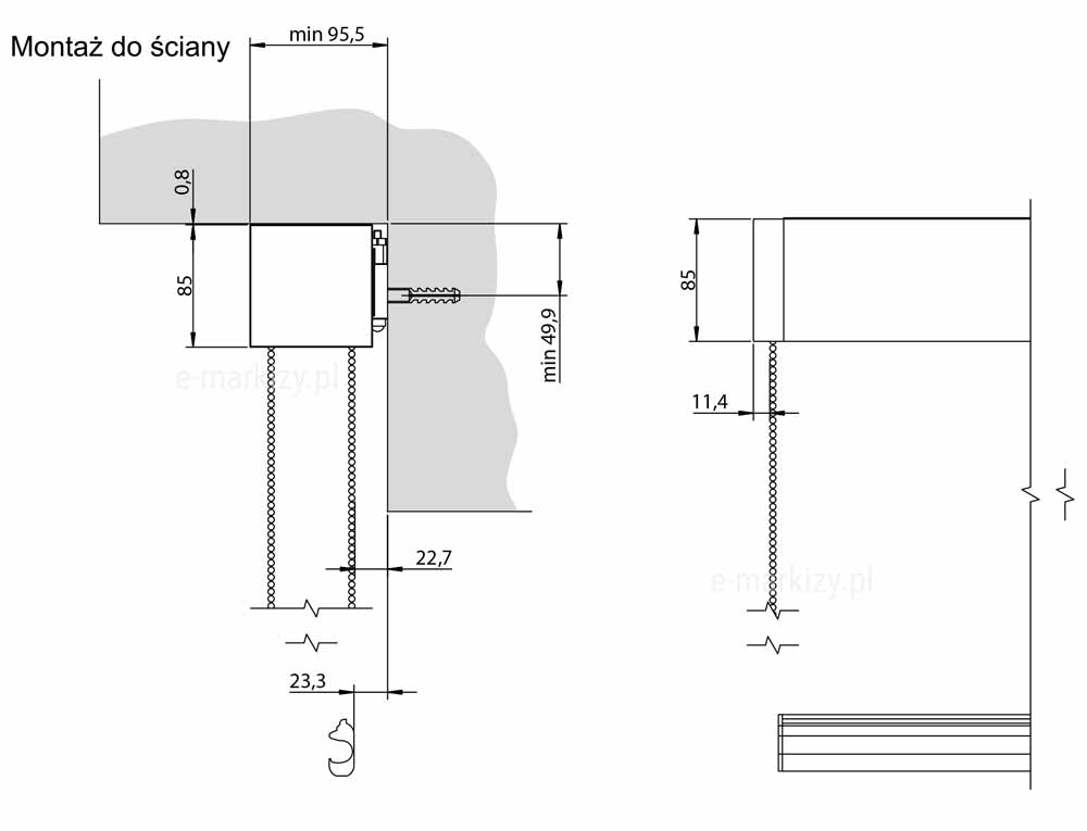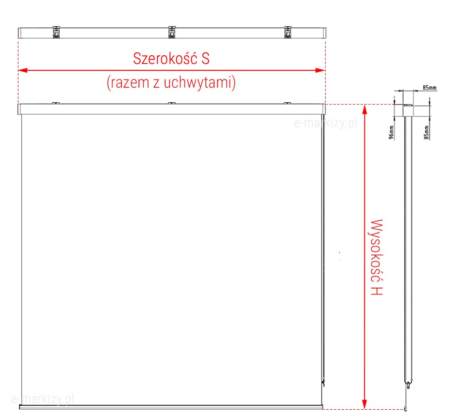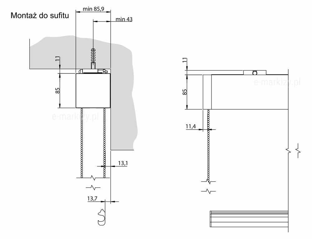 Refleksol 85 - napęd łańcuszkowy - Dane Techniczne - Refleksol 85 Manual, komponenty refleksola, klip montażowy, kaseta, belka dolna, łańcuszek, Refleksol 85 Manual, kaseta refleksola, uchwyt sufitowo-ścienny, belka dolna, rura nawojowa, przekrój kasety refleksola, Refleksol 85 Ma montaż do ściany, mocowanie refleksola ścienne, Refleksol 85 Sa montaż do ściany, mocowanie refleksola ścienne, Refleksol 85 Ma montaż do sufitu, mocowanie refleksola sufitowe, Refleksol 85 Sa montaż do sufitu, mocowanie refleksola sufitowe, Refleksol 85-ma strona sterowania, napęd do refleksoli, elektryczne refleksole
